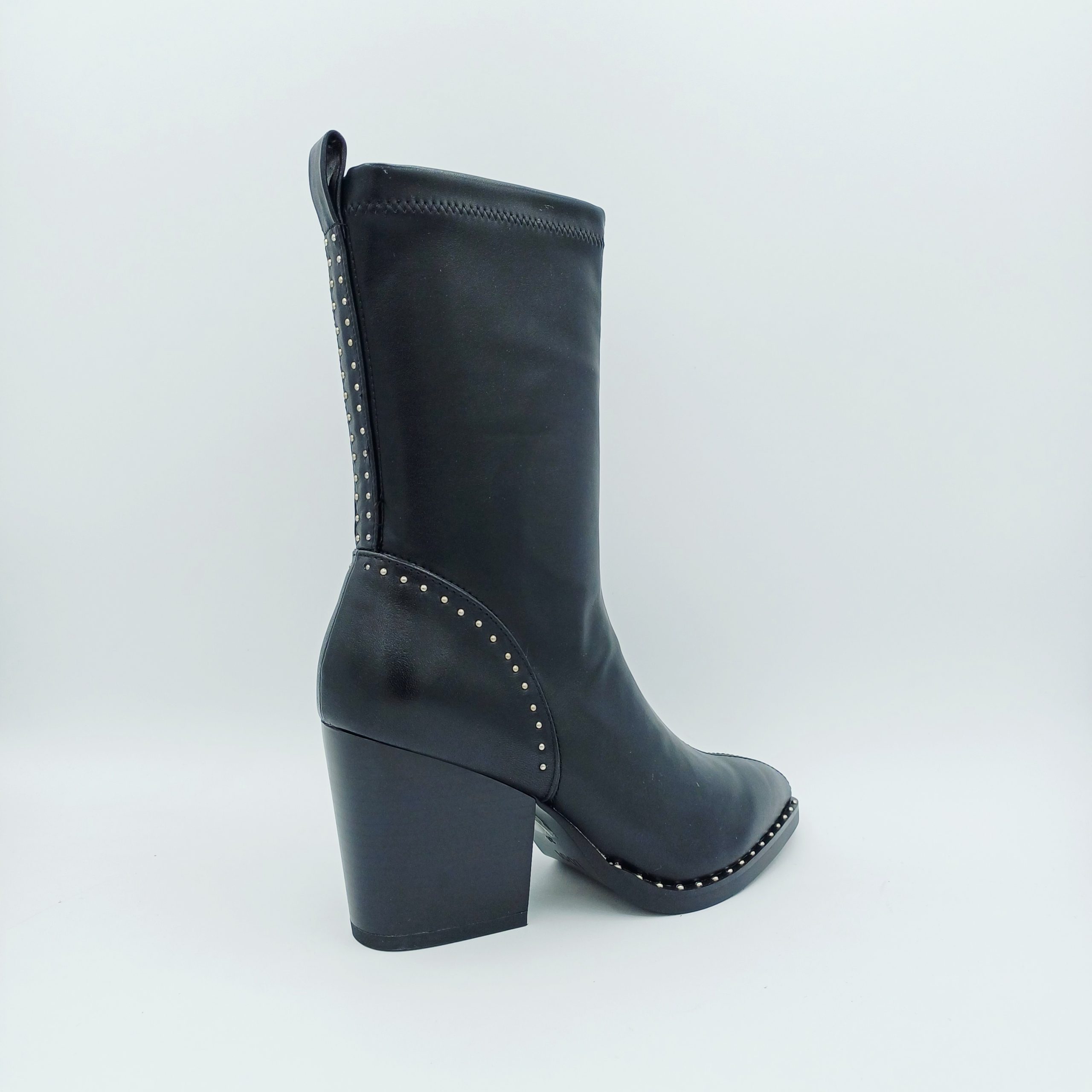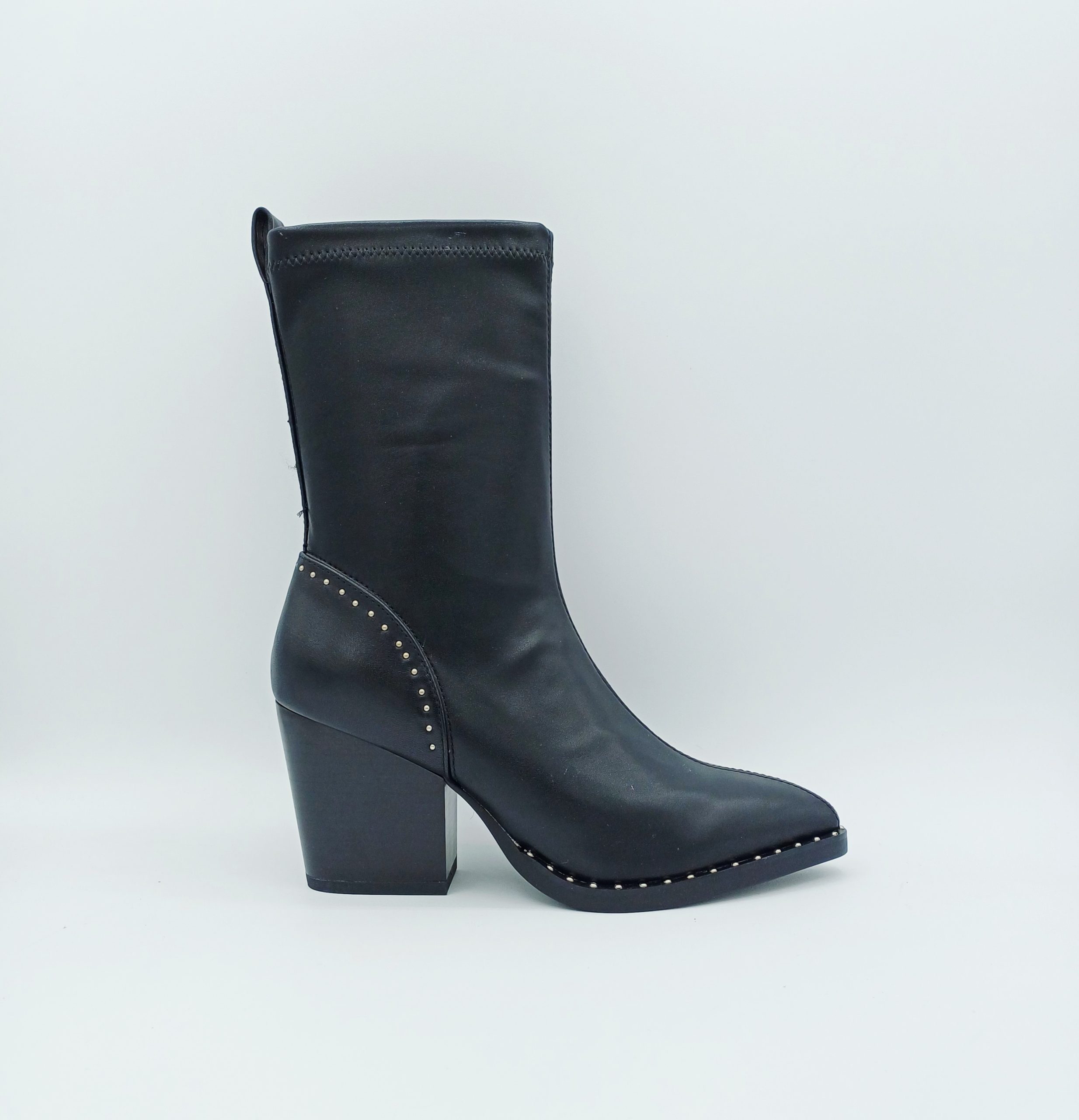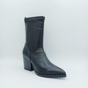 Bota de media caña en piel negra con pespuntes al tono y tacón tipo cubano de la marca LODI.