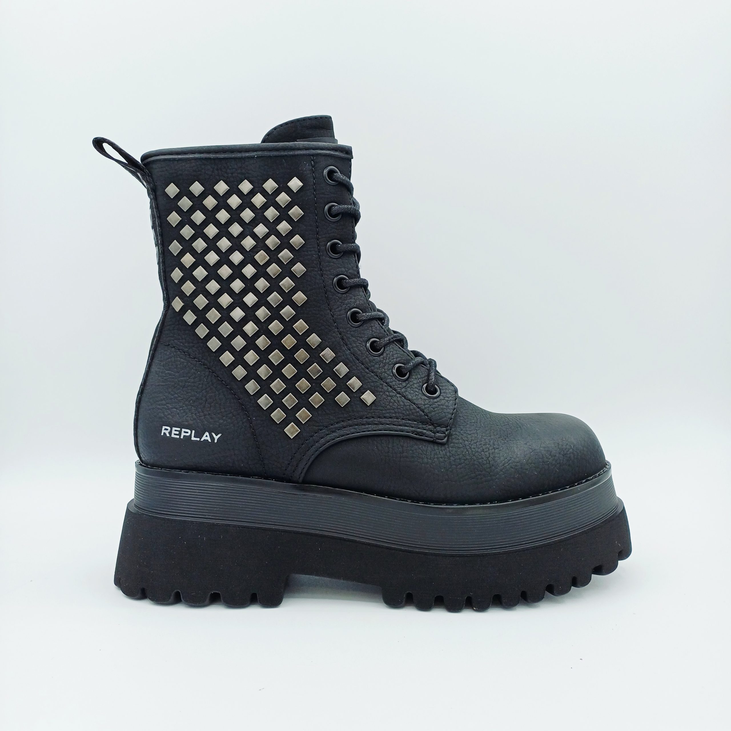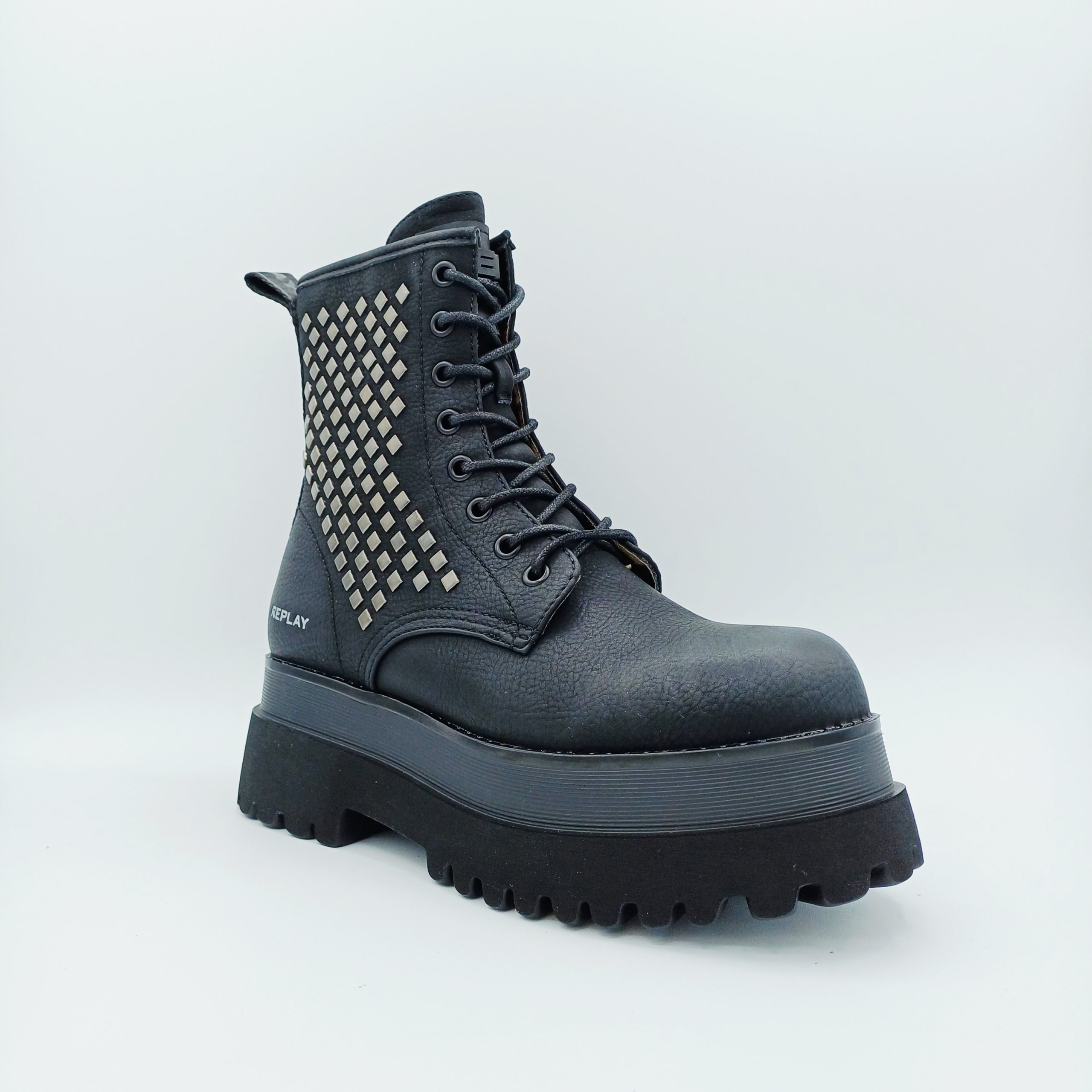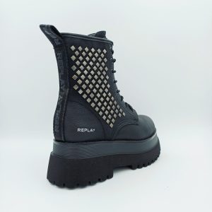 Botín negro marca REPLAY de tipo biker con tachas en la caña