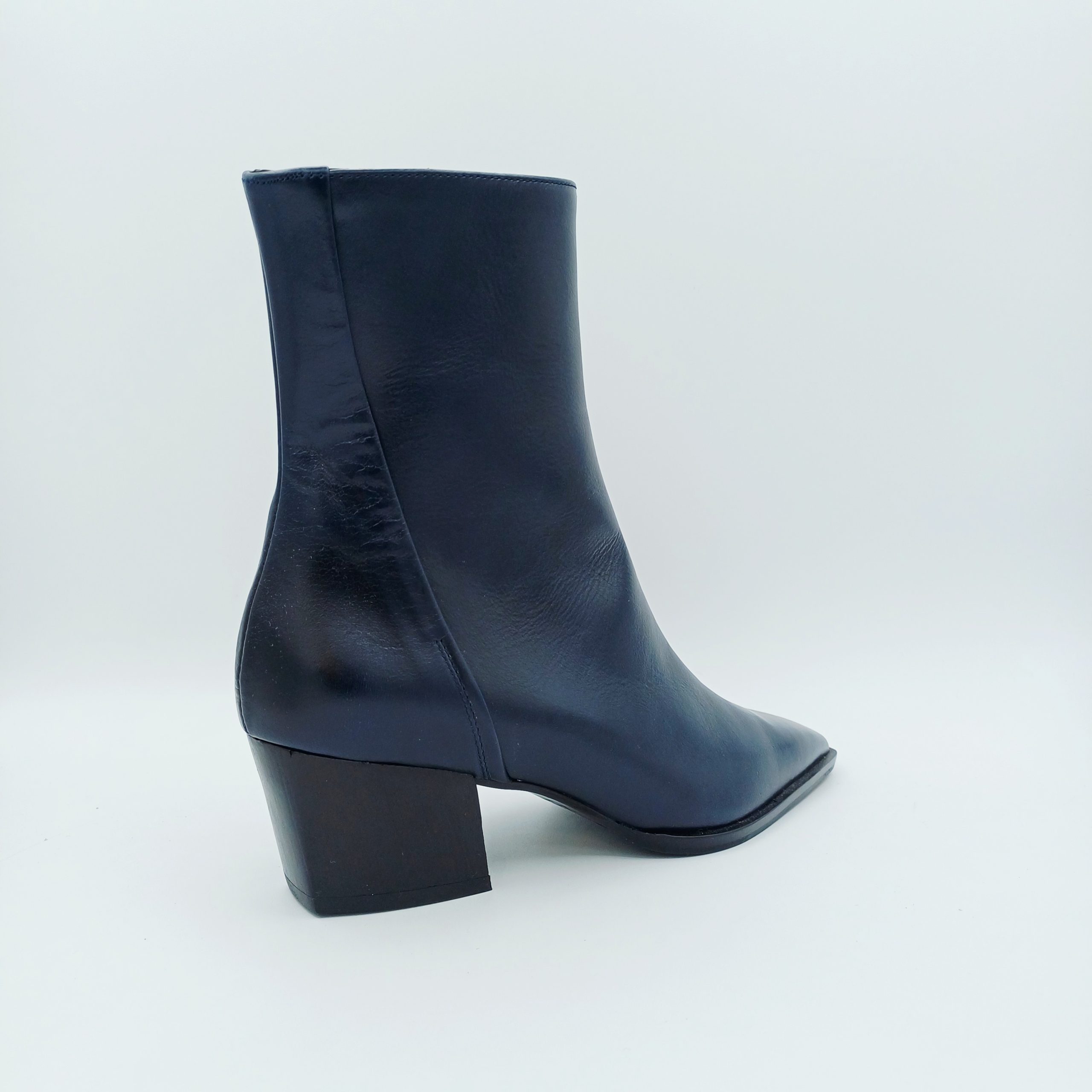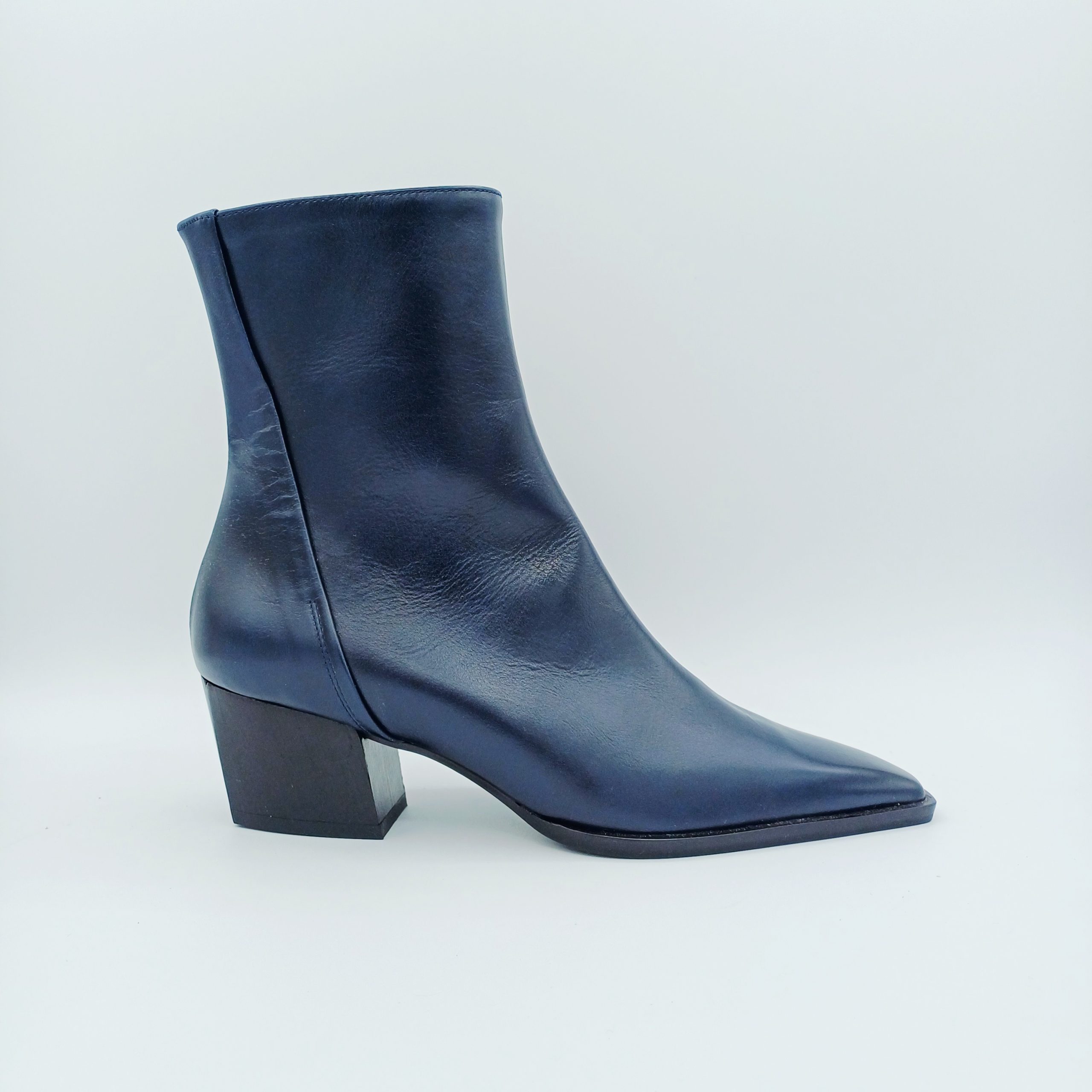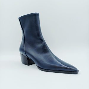 Botín en piel azul marino de la marca ZINDA con acabado en punta y tacón medio cubano.