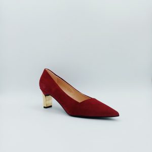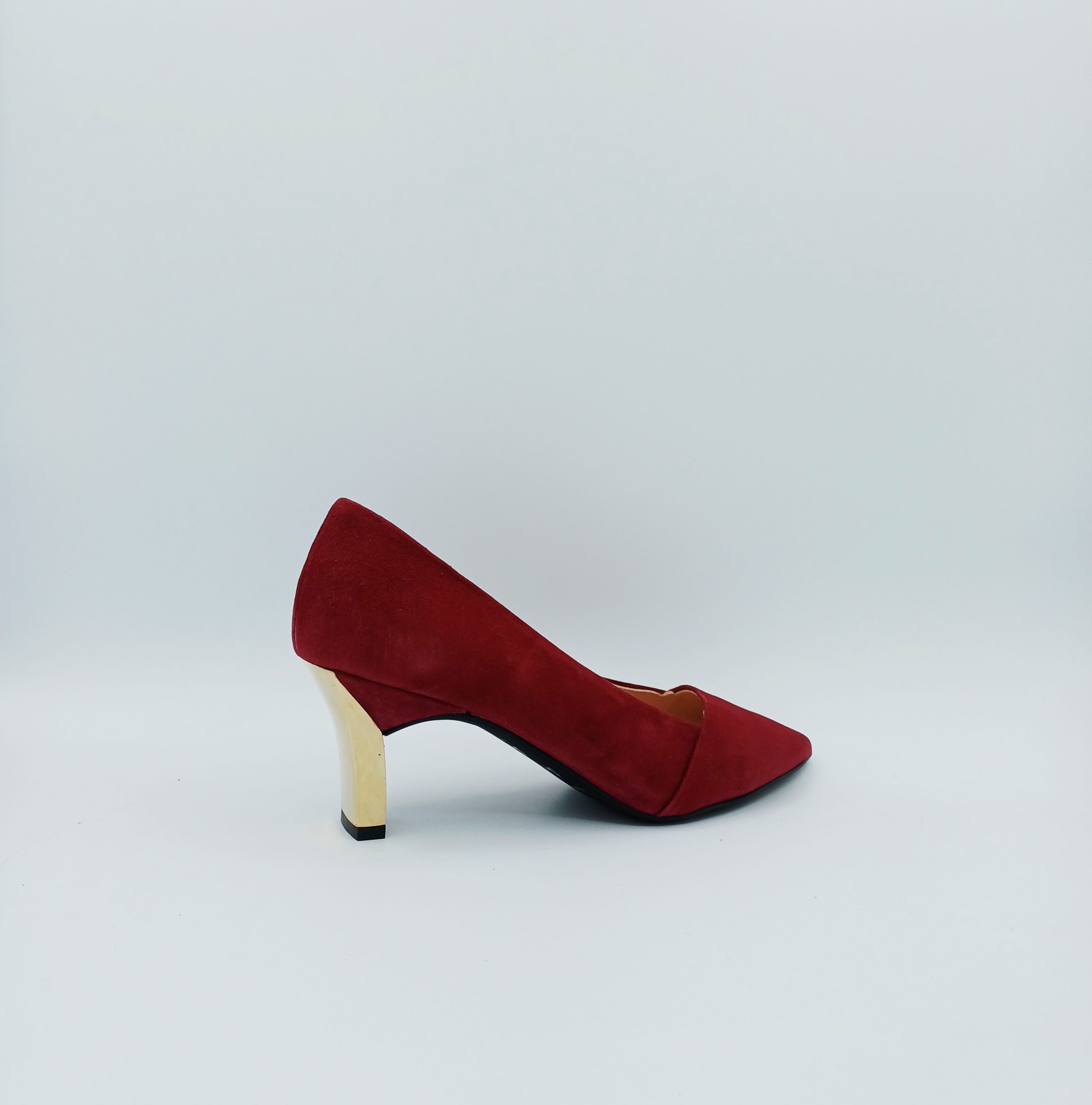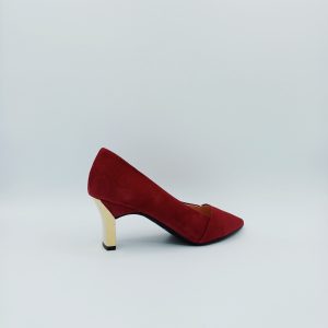 Salón en ante burdeos con tacón medio dorado adaptado a cualquier ancho de pie.