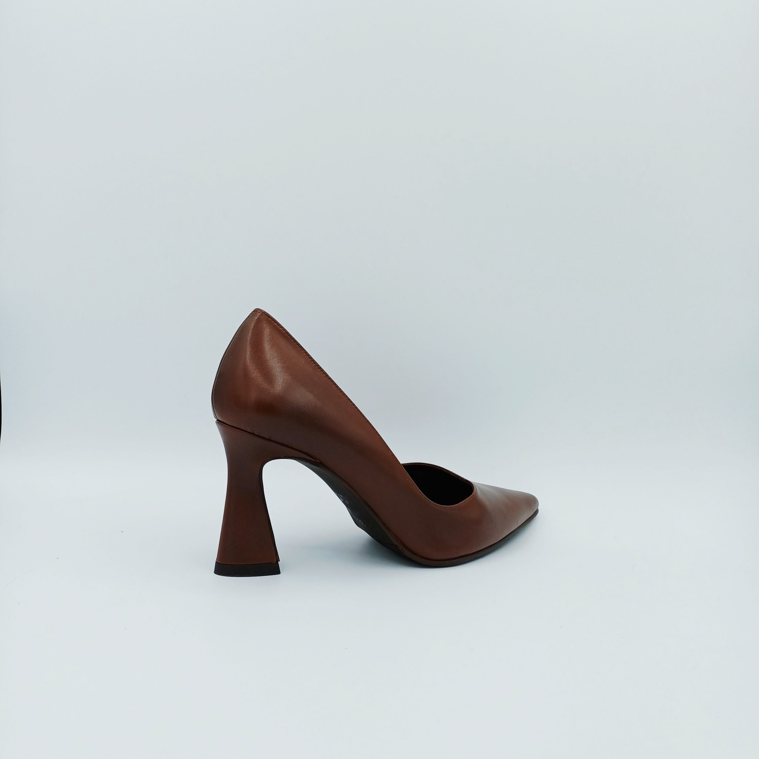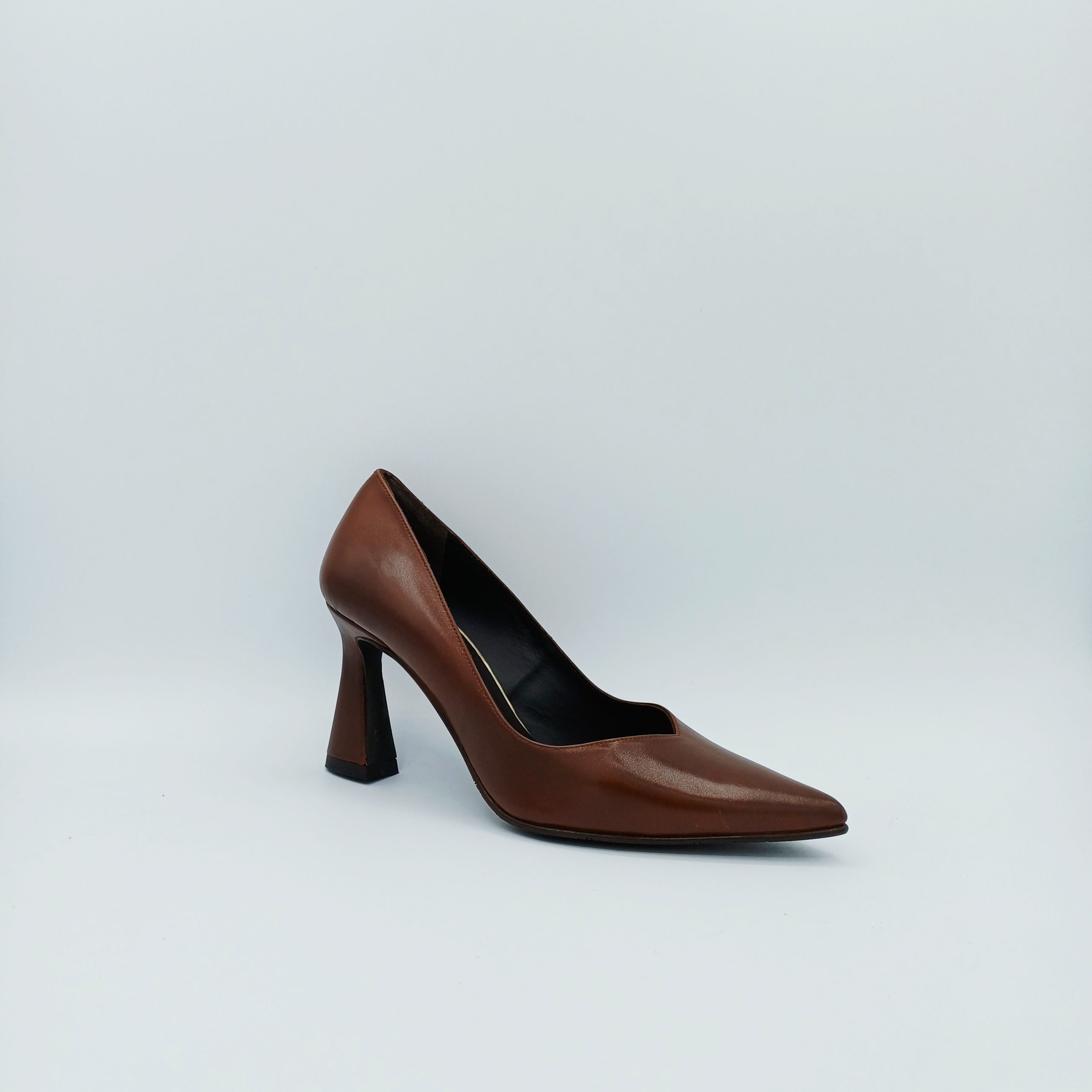 Salón con tacón alto y ancho y escote en V en piel color burdeos de la marca LODI.