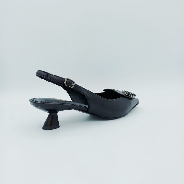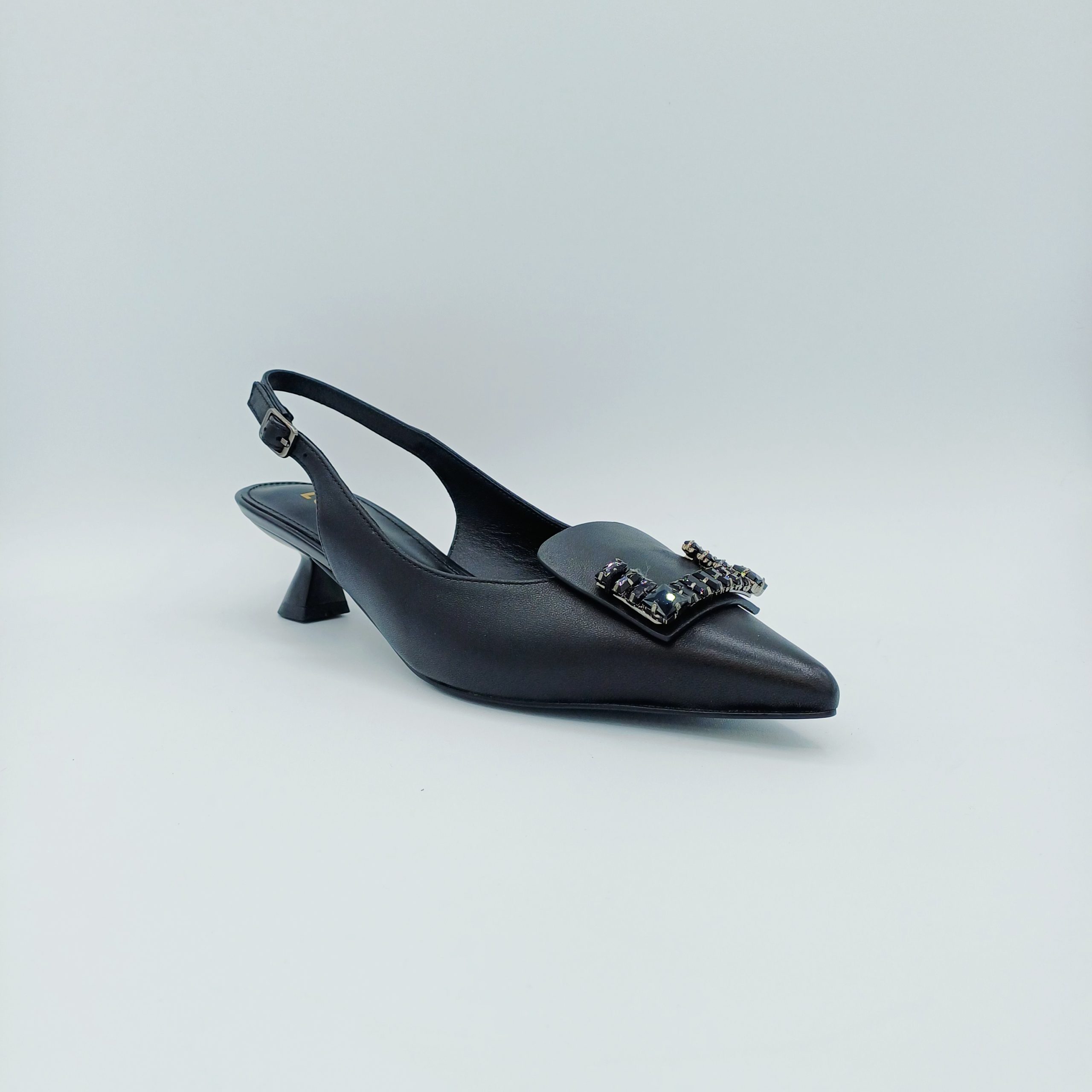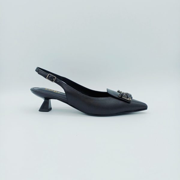 Salón tacón bajo y destalonado en napa negra de la marca LODI