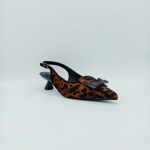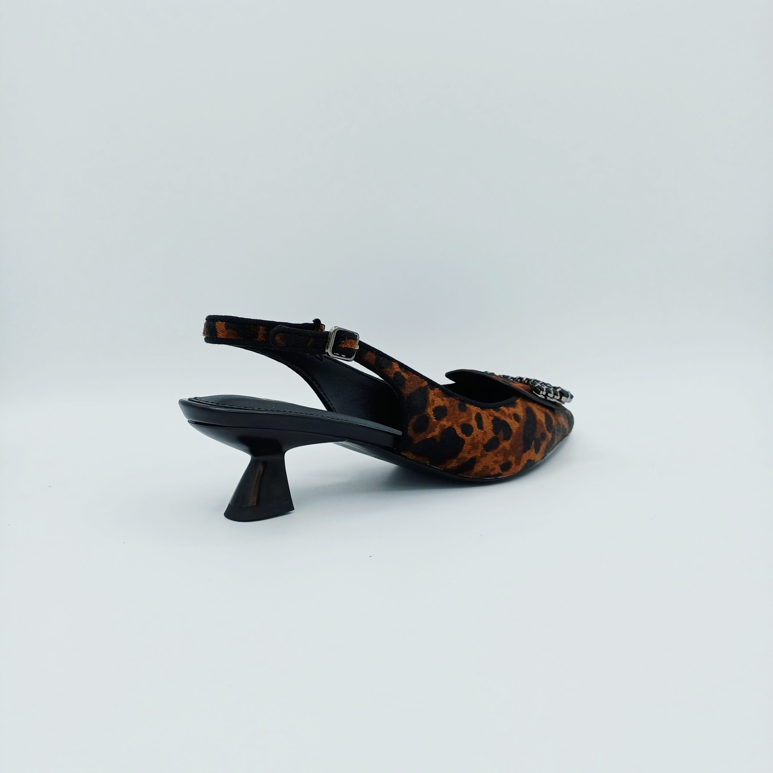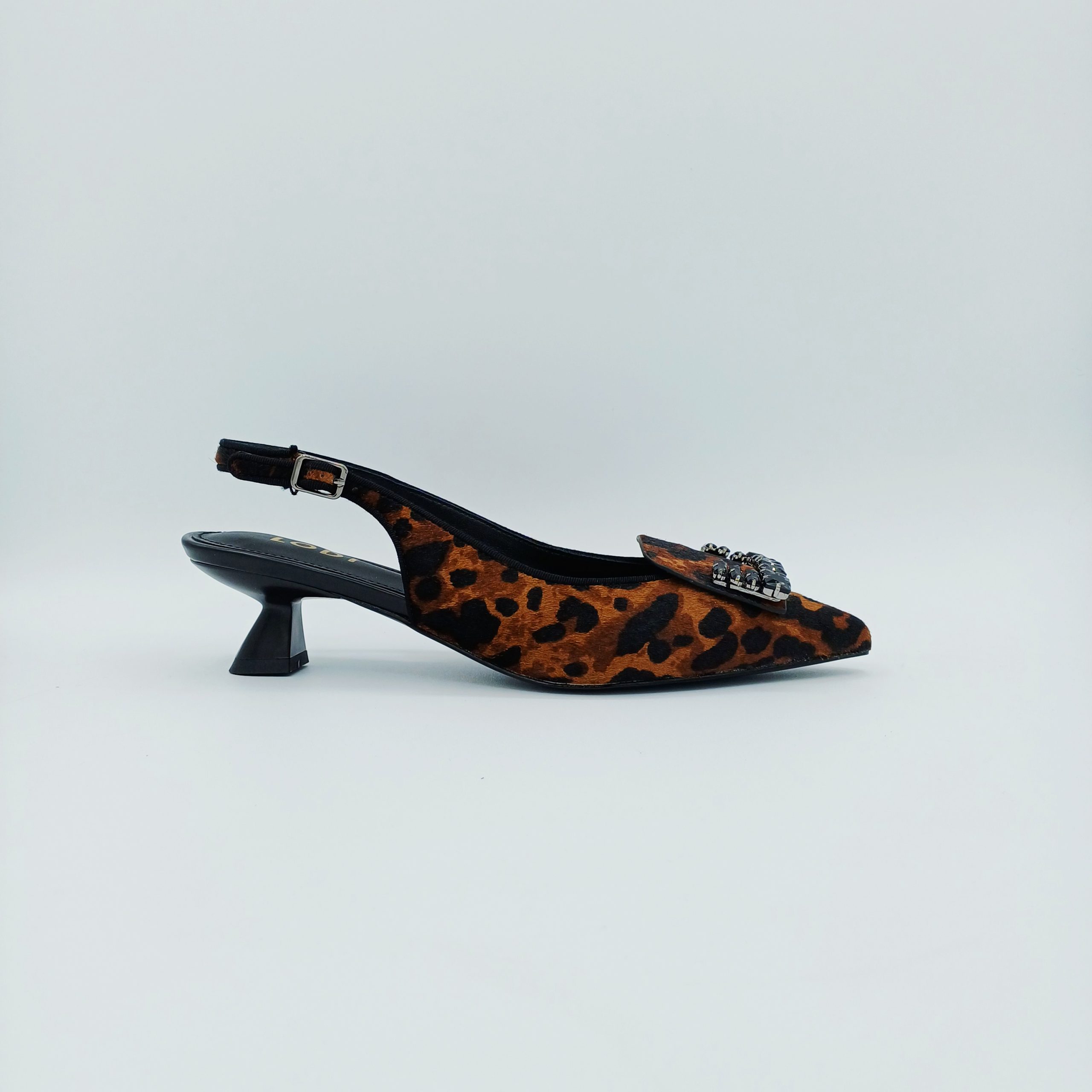 Salón tacón bajo y destalonado en piel animal print en tonos rojizos y marrones